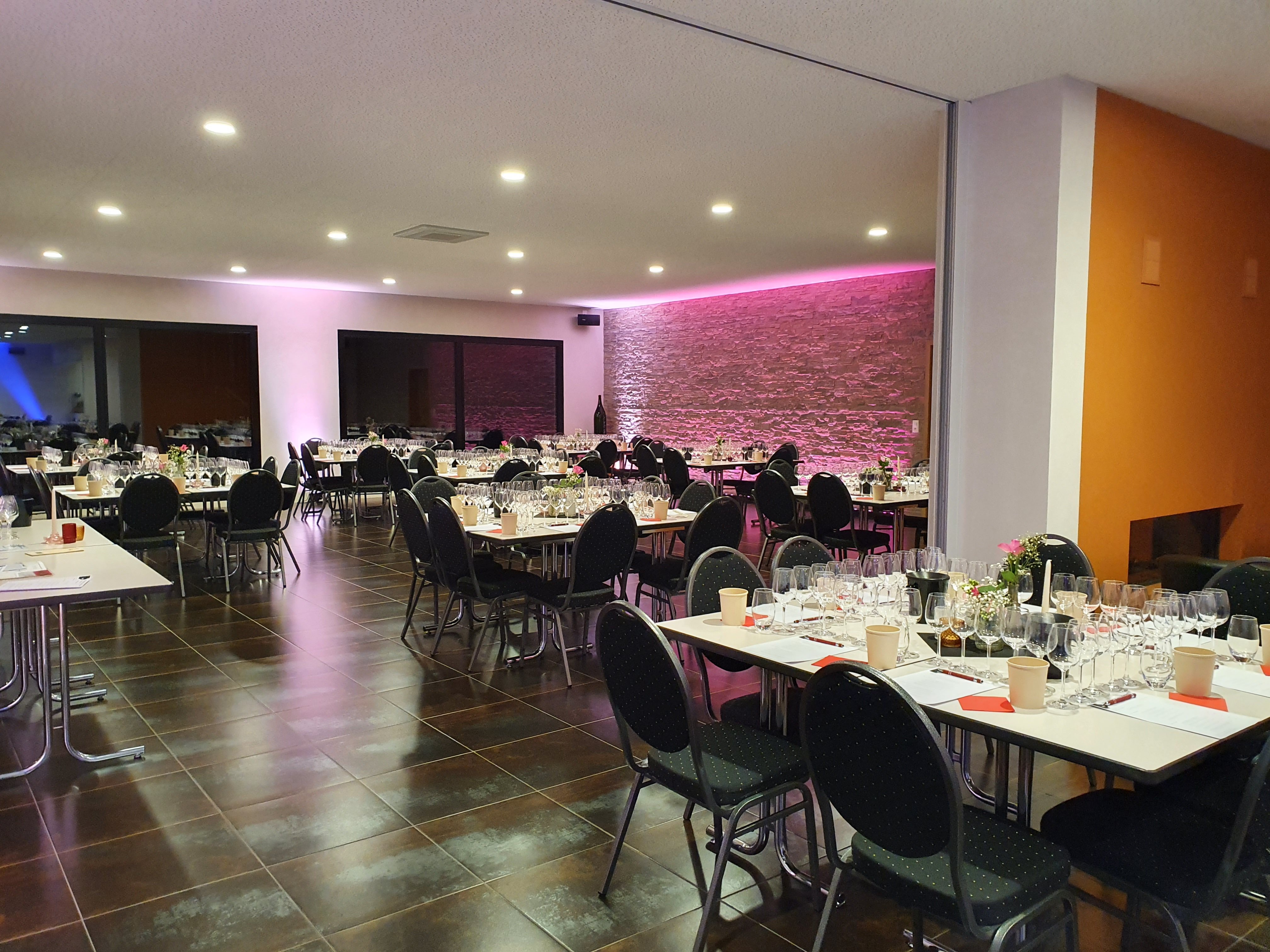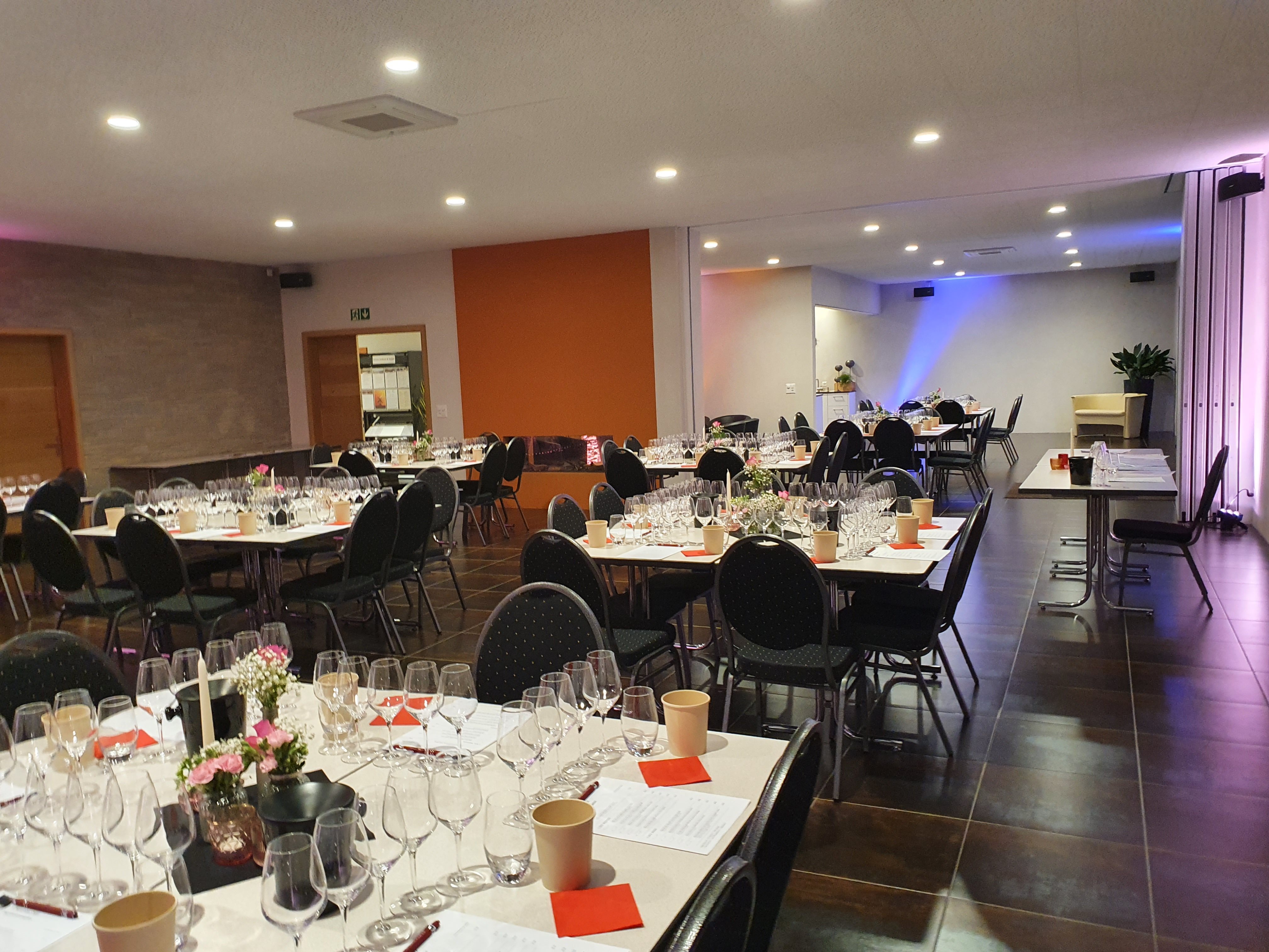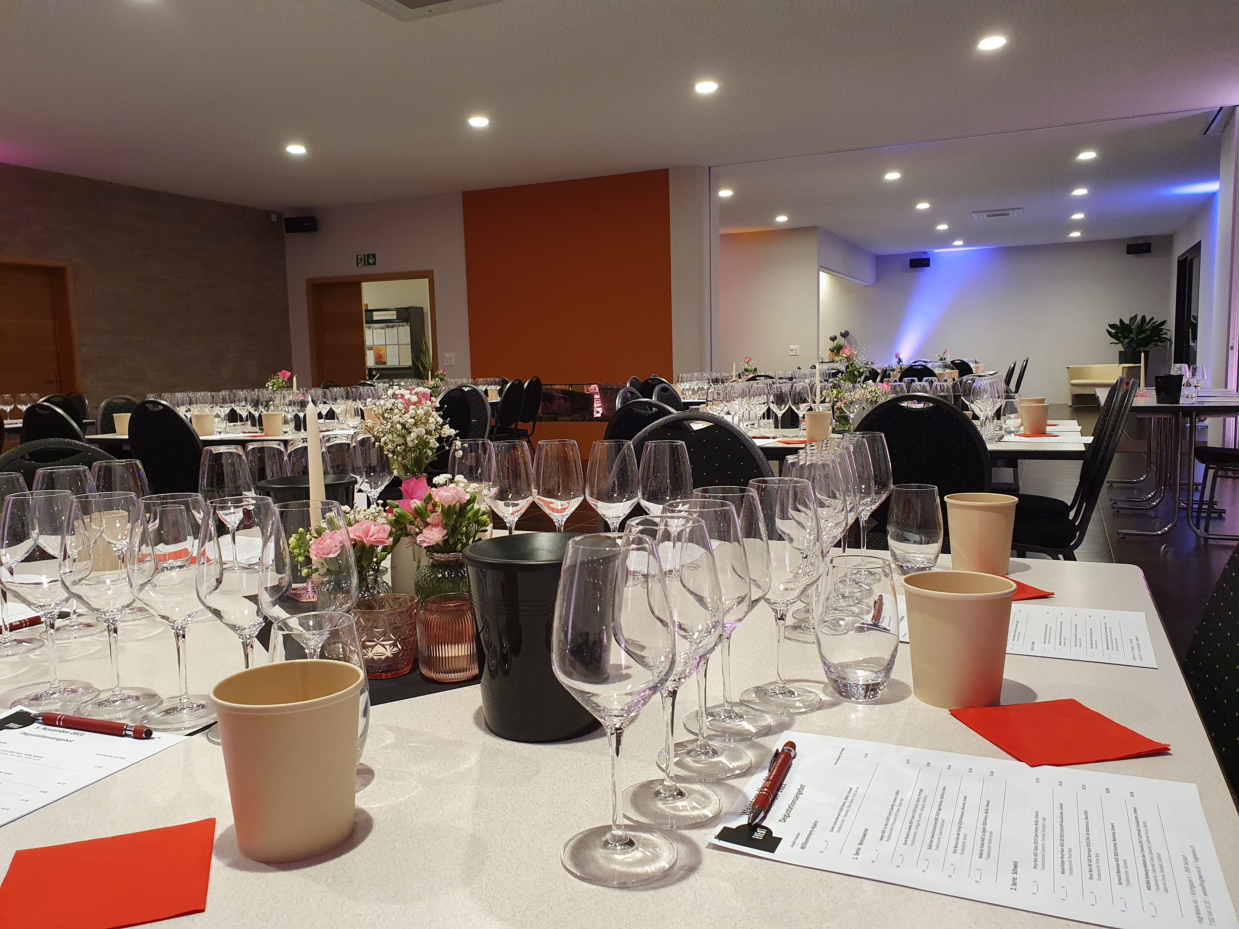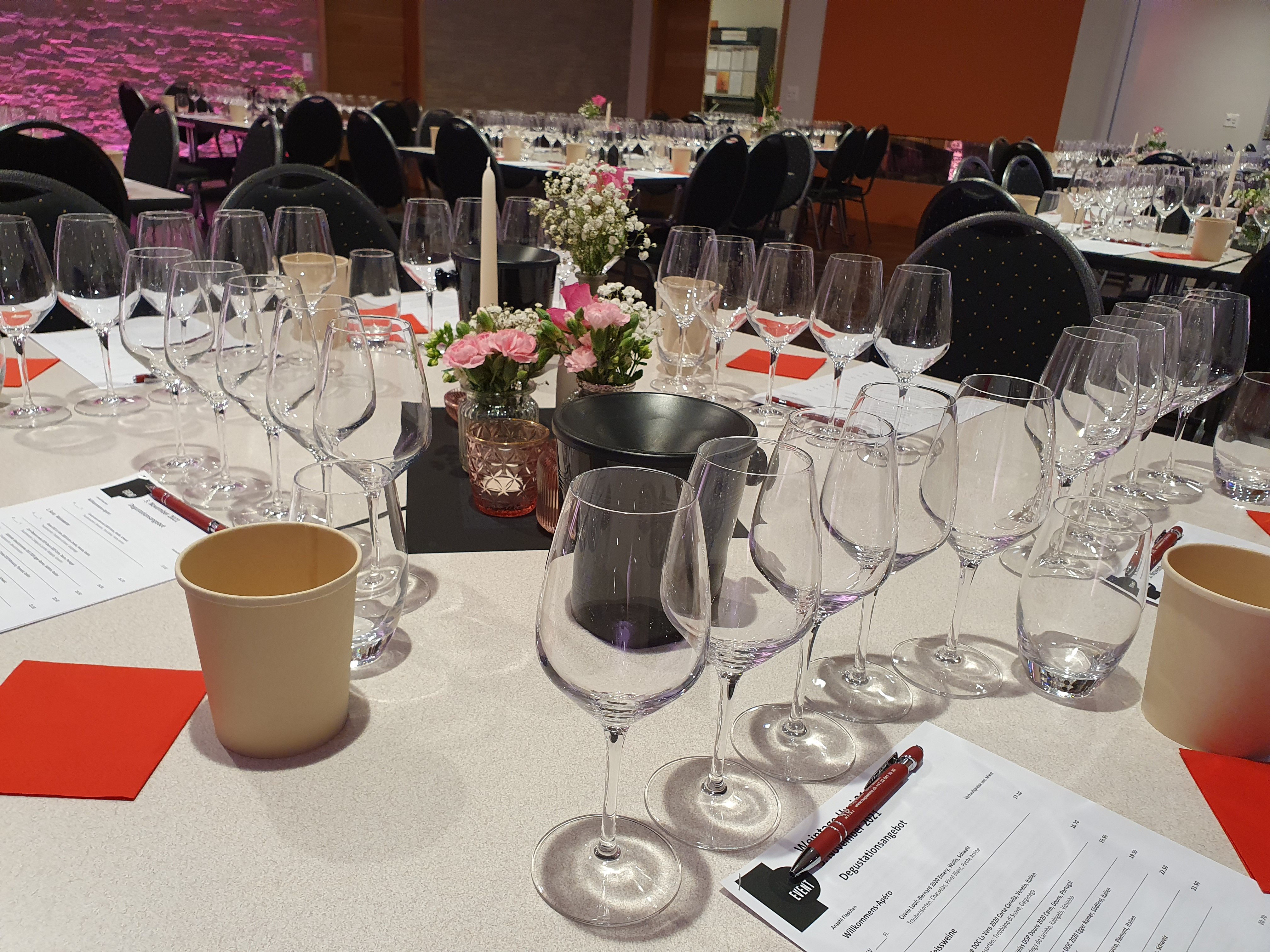 Die Degustation erfolgte sitzend an Tischen. Es wurden in 6 Serien mit je 5 verschiedenen Weinen, insgesammt 30 Weine aus unserem vielfältigen Sortiment präsentiert und komentiert.