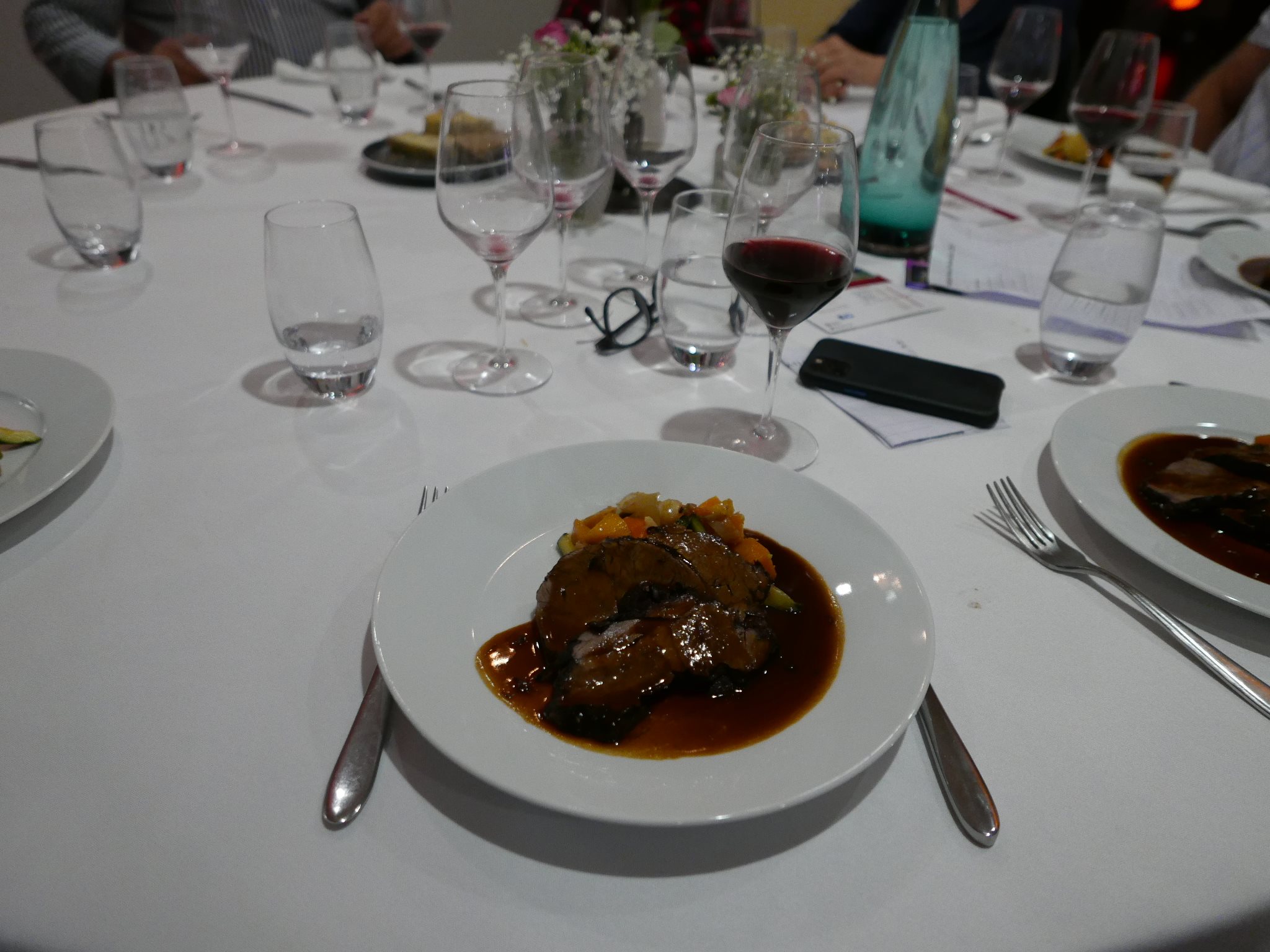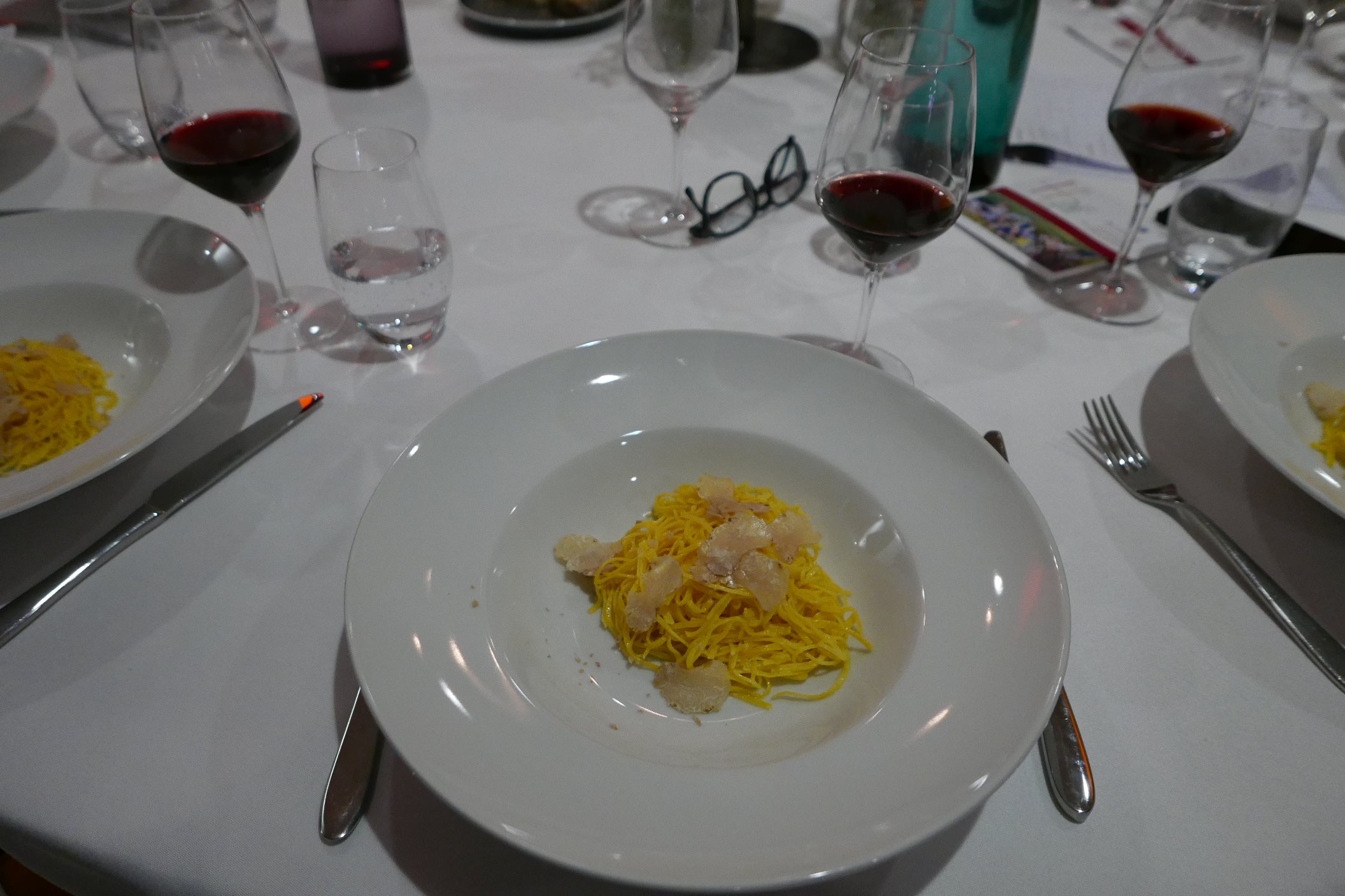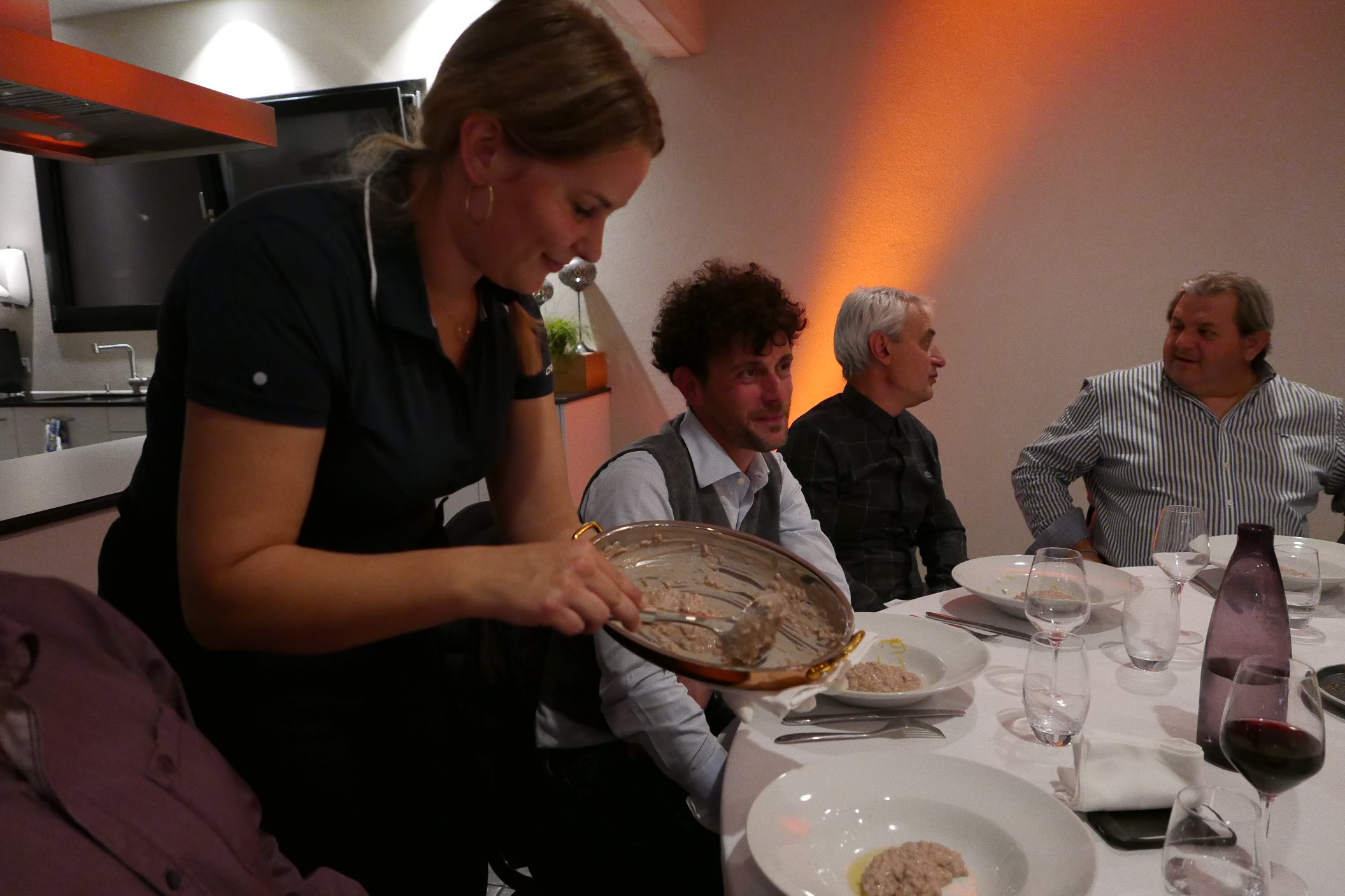 Als erste Vorspeise wurde uns ein für diese Region typischer Wintersalat mit Frischkäse, Baumnüssen, Honig und Birnen aufgetischt. Danach gab es ein vorzügliches Kalbstartar mit dem Messer nach piemontesischer Art geschnitten. Weiter wurden uns köstliche mit Hackfleisch gefüllte Zwiebeln (Cipolle Ripiene) serviert. Als Primi Piatti erhielten wir herrliche, frisch gemachte Nudeln mit weissem Trüffel angerichtet und danach einen schmackhaften Barolo Risotto. Ein wunderbar zubereiteter Rindsschmorbraten an einer Barolo Sauce mit Gemüse bildete den Hauptgang. Als Dessert wurde uns ein wohlschmeckendes Semifreddo al Torrone (eine halbgefrorene Glace) gebracht.