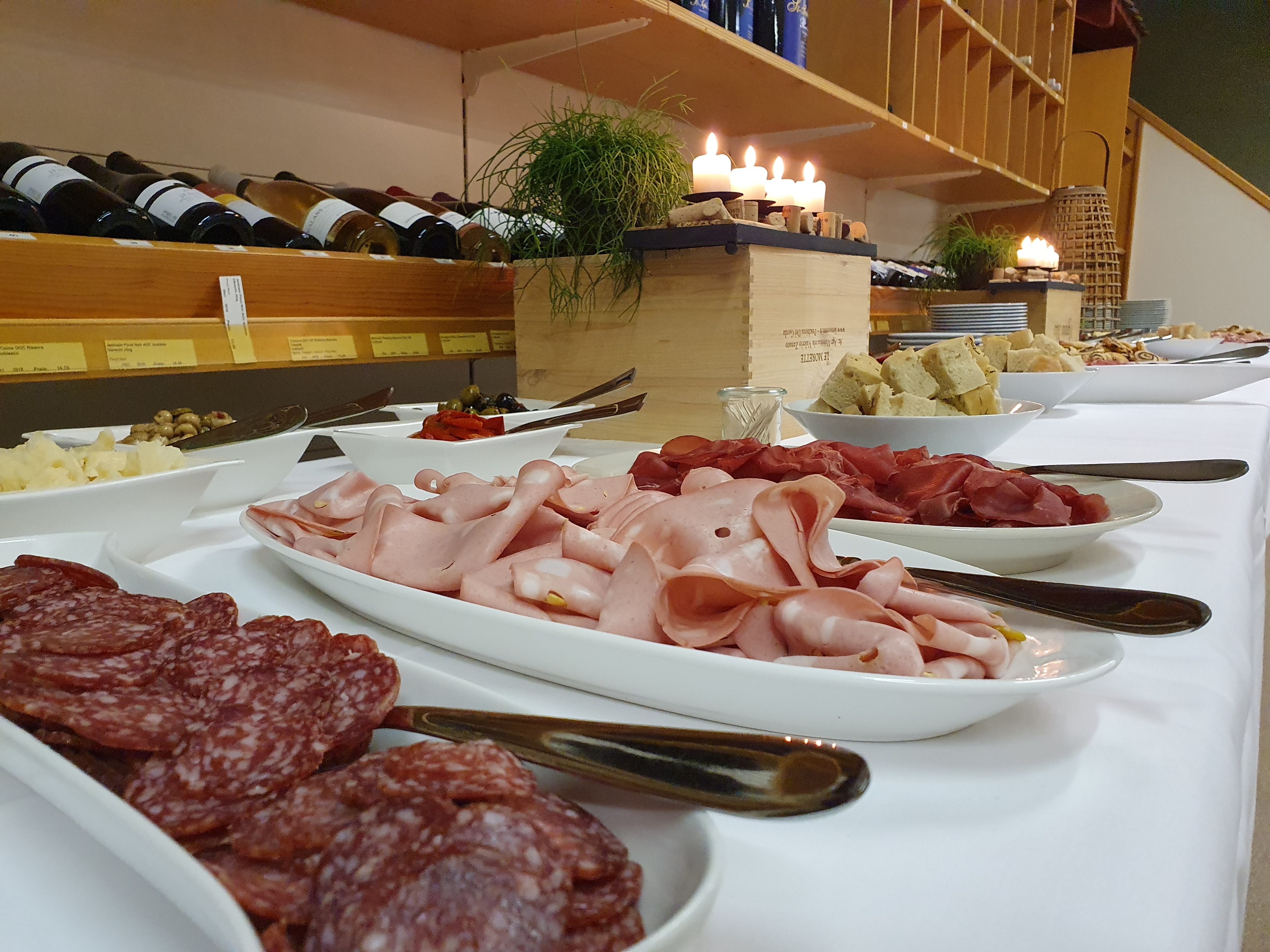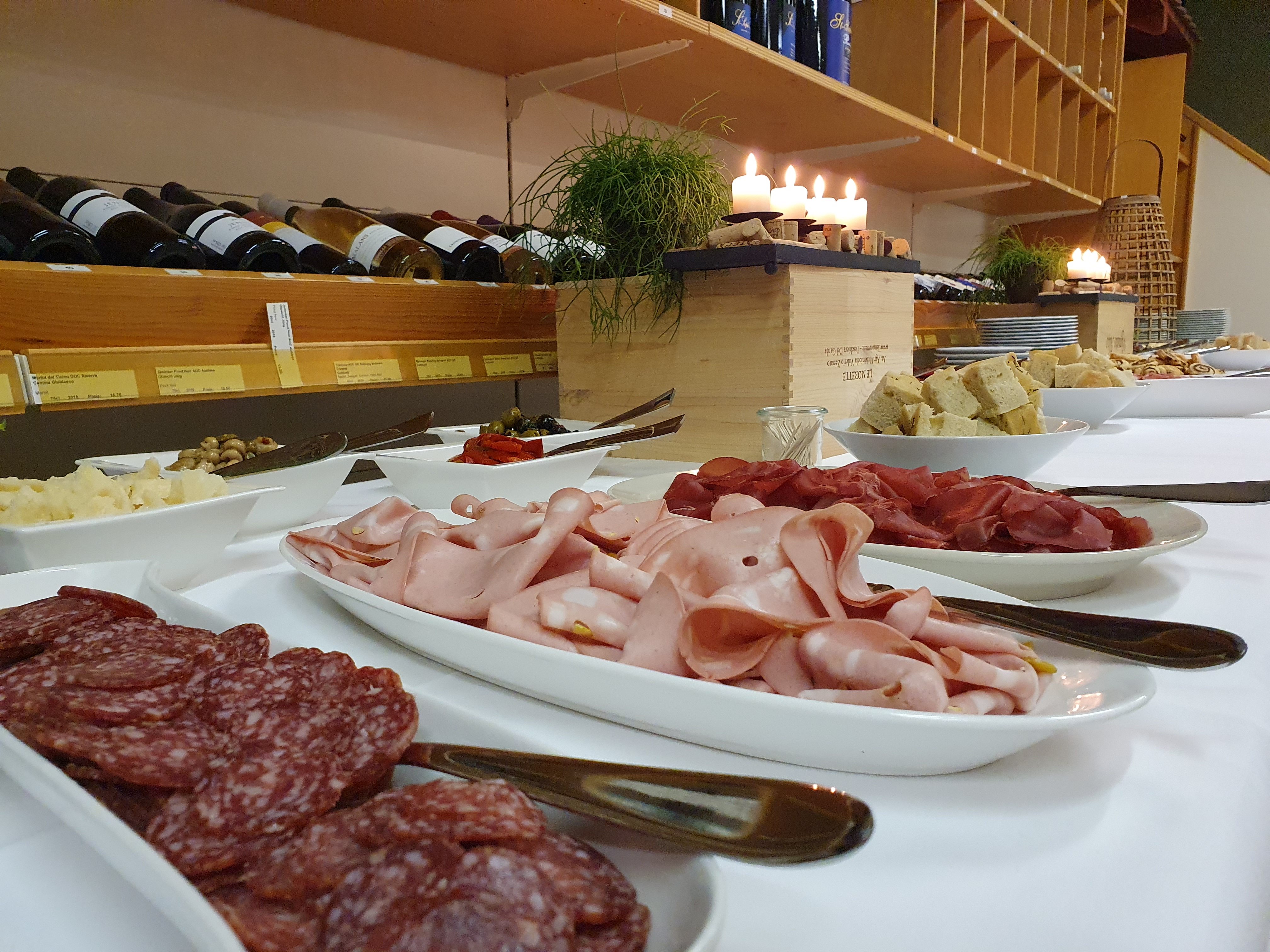 Empfangen wurden die Teilnehmenden mit einem erfrischenden Moscato extra Secco (Prosecco Konkurrenz) aus dem Hause Cascina Fonda. Der Winzer Massimo Barbero war persönlich anwesend und schenkte den Gästen das köstliche Getränk ein. Wer keinen Schaumwein degustieren wollte, konnte direkt zu den Ständen der Weiss- und Rotweine gehen, die sich im Gewölbekeller befanden. Dort wurden sie herzlich von den italienischen Winzern Loris Massucco und Marco Molino sowie Martin Reinhart aus dem Team Hugi willkommen geheissen. Zur Degustation angeboten, wurden die ausdruckstarken und edlen Piemonteser Spitzenweine Arneis, Barbera, Nebbiolo, Terramore, Barbaresco und natürlich Barolo. Dazu gab es an einem üppigen Buffet herrliche Antipasti wie Salami, Mortadella, Coppa, Trockenfleisch, würziger Käse, Brot mit Kräutern sowie selbstgemachtes Gebäck und weitere Köstlichkeiten. Wie immer fanden im faszinierenden Gewölbekeller, zwischen Wein- und Spirituosenregalen und an kleinen Tischen umgeben von ausgestellten Weinen interessante und anregende Diskussionen zwischen den Gästen, aber auch mit den Winzern statt.